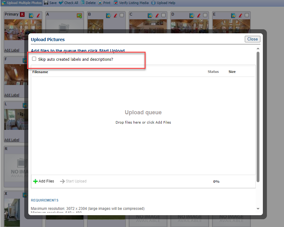 For members that have the ability to add/edit listings. If you do not wish for the automatic description to be placed on each photo, in the upload pictures section of a listing, please check the box 'Skip auto created labels and descriptions?'